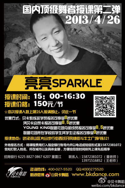 我們貝卡舞蹈的好朋友,同時(shí)也是這次CA高校街舞大賽的評委之一,中國HIPHOP DANCE大神---亮亮老師 @亮亮Sparkle龍舞蹈 ,時(shí)間在CA大賽的前一天,也就是4月26日下午三點(diǎn),僅此一節,機會(huì )難得,大家不見(jiàn)不散。