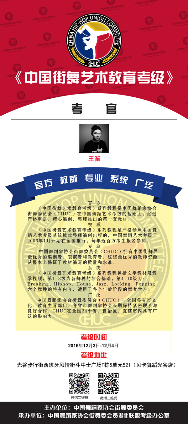 為了提高中國少年兒童街舞舞蹈水平、規范教學(xué)管理,實(shí)現街舞職業(yè)化、專(zhuān)業(yè)化、規范化,以更好地在全國范圍內普及推廣街舞文化,促使街舞文化更加快速的發(fā)展,中國舞蹈家協(xié)會(huì )街舞委員會(huì )于2016年開(kāi)始在全國各地區開(kāi)設“少兒街舞等級考試”。中國舞蹈家協(xié)會(huì )街舞委員會(huì )授權貝卡舞為此次少兒街舞等級考試武漢站承辦方。