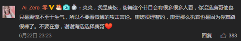首位引發(fā)隊長(cháng)們沖突的炎炎在節目播出后微博上面引發(fā)了不小的爭論。很多人都因為炎炎的選擇造成了韓庚老師吃蘋(píng)果核而感到憤怒,認為炎炎就應該像電影情節那樣,至始至終跟著(zhù)韓庚幫助他奪得榮耀
